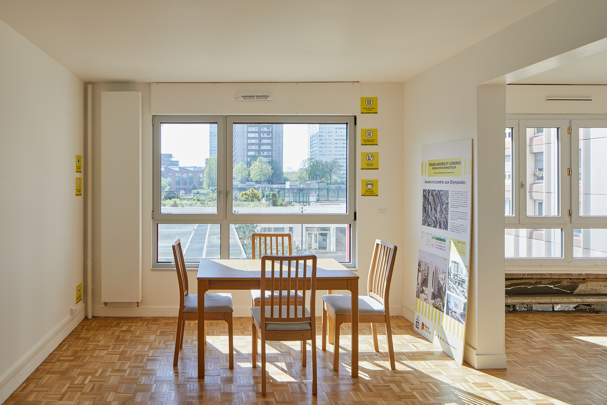 Démarrage du chantier pour la réhabilitation des 579 logements des tours Anvers et Londres, quartier des Olympiades, à Paris 13e. Logement témoin et premiers tests de façade en perspective